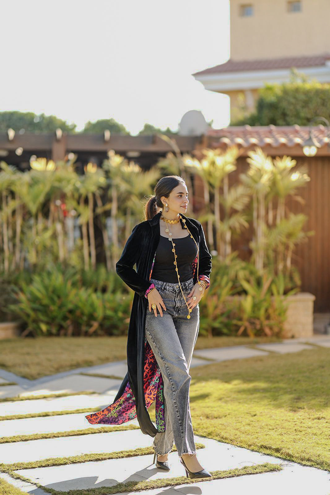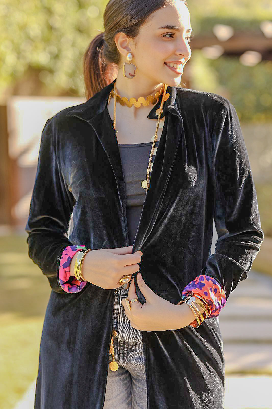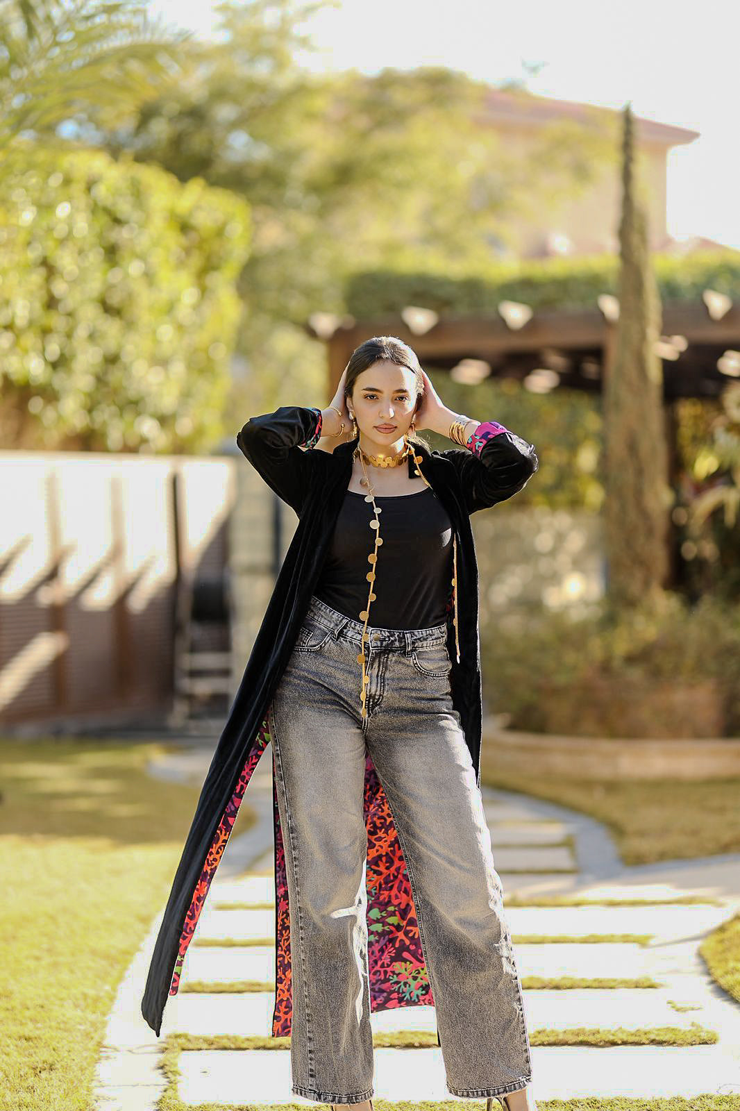 The Noir Motion Open Qaftan is designed for effortless movement and modern expression. Crafted in a sleek black silhouette, it reveals a bold, artistic lining that comes alive as you walk — adding depth, contrast, and individuality to the look.