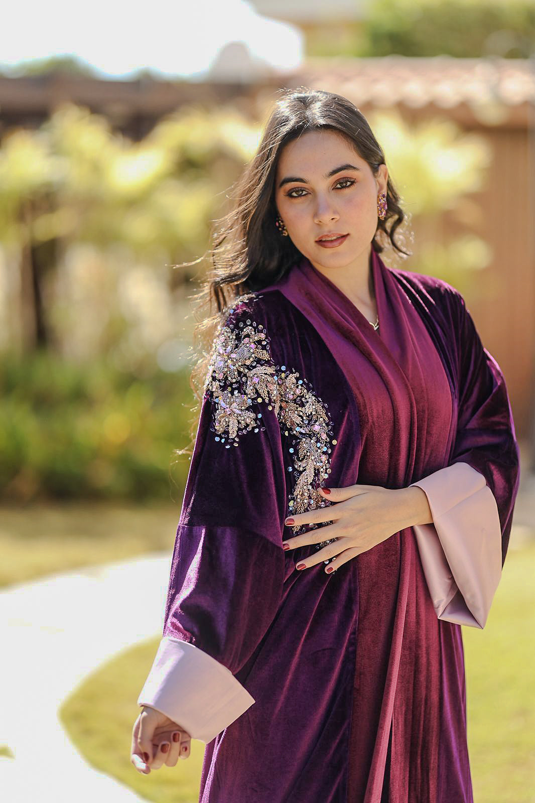 The Burgundy Peacock Kaftan is crafted from rich velvet in a deep burgundy tone, elevated with intricate peacock-inspired embroidery that adds texture, depth, and refined brilliance.