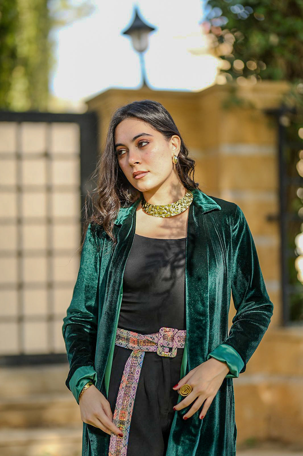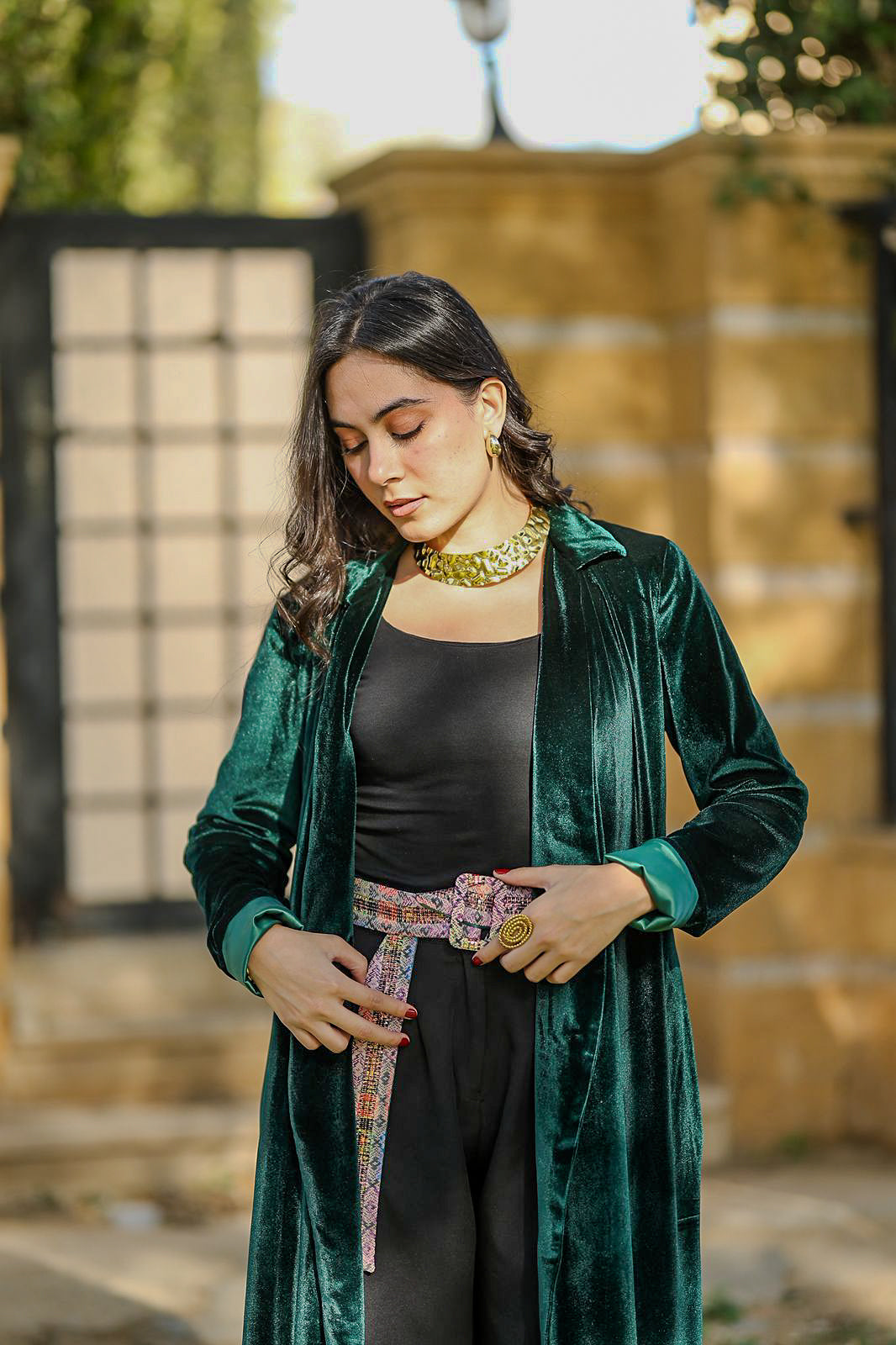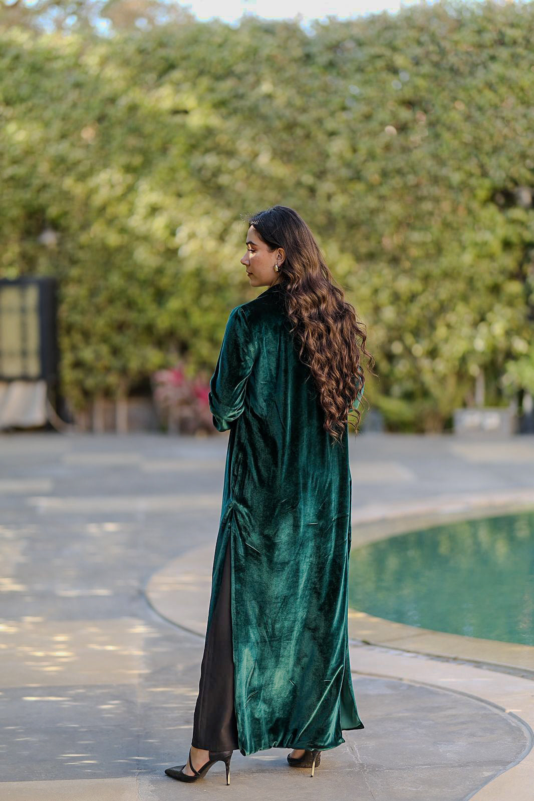 Crafted from rich emerald velvet, this flowing silhouette is designed to move effortlessly with you—soft, refined, and confidently understated.